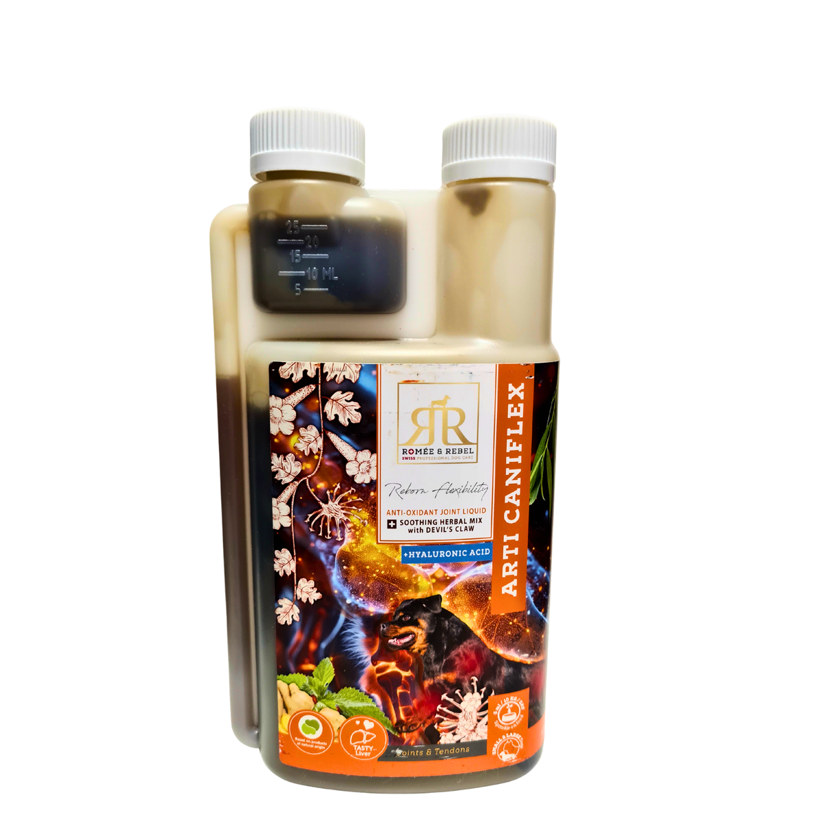 Arti Caniflex intègre également des extraits naturels de plantes tels que le saule blanc, la griffe du diable, les feuilles de cassis et le gingembre, reconnus pour soutenir le système musculosquelettique et aider à réduire l’inconfort.